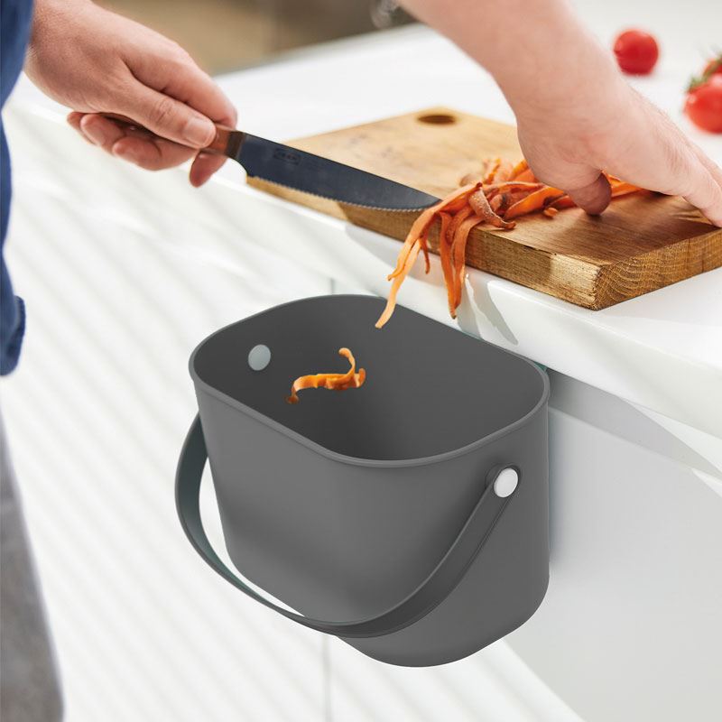 Stilsicher trennen! Der kompakte Bioabfallbehälter sammelt Küchenabfälle, Kaffeekapseln oder Spültabs sauber und bequem. Der Deckel kann in geöffneter Position fixiert oder sogar abgenommen werden für eine großzügige Öffnung. Dank integriertem Griff gelingt das Entsorgen mühelos. Ob auf der Arbeitsflächeoder aufgehängt passt er in jede Küche. Aus 94 % recyceltem Material gefertigt, verbindet er Design mit Umweltbewusstsein.Größe: 22,2 x 17,2 x 14,7 cmVolumen 3,2 lVE = 4 Stück