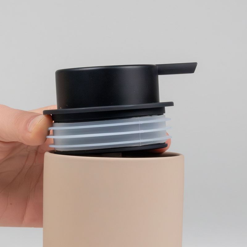 Skandinavische Eleganz fürs Bad. Der Seifenspender aus hochwertiger Keramik verbindet nordisches Design mit praktischer Funktionalität. Die rutschfeste Oberfläche und die abnehmbare schwarze Pumpe sorgen für komfortable Handhabung und leichte Reinigung. Zeitlos gestaltet, setzt er stilvolle Akzente im Bad und lässt sich ideal zu einer harmonischen Serie mit Zahnputzbecher und WG-Garnitur in den kommenden Quartalsprämien ergänzen. Volumen: 300 mlGröße: Ø 9 × 14,5 cmFarbe: schwarz, beige (nach Verfügbarkeit) VE = 2 Stück